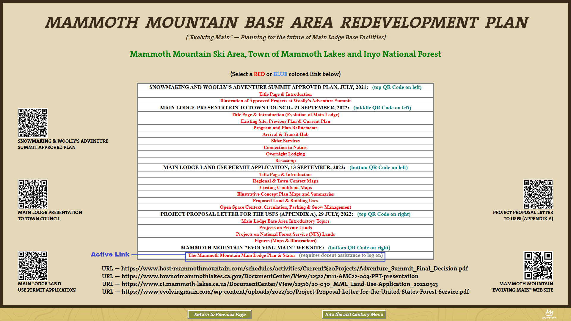 | Mammoth Mountain Base Area Redevelopment Plan (WEB Link is enclosed within a BLUE box) | • Mammoth Mountain "Evolving Main" WEB Site (Mammoth Mountain Main Lodge Plan & Status) |
